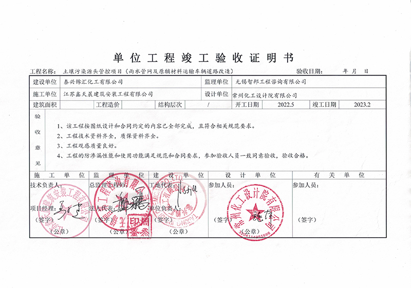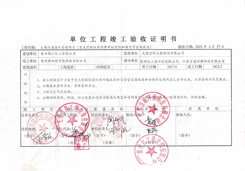 泰興錦匯化工有限公司雨水管網(wǎng)改造和破損道路改造單位工程及重點區(qū)域防腐防滲和架空管道架改造單體工程竣工驗收證明